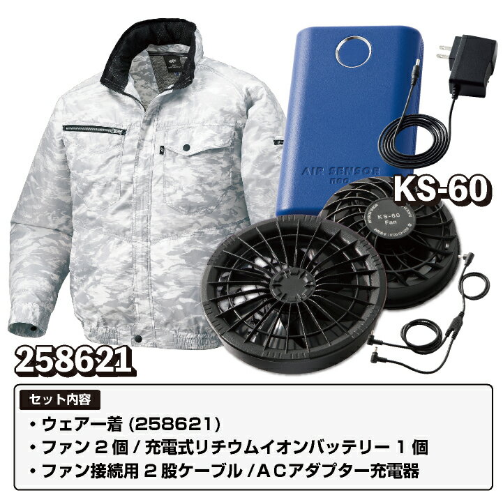 セット内容 空調服+ファンセット +リチウムバッテリーセット 258621 (長袖ジャンパー) KS-11 (ファン+ケーブル) KS-12 (リチウムイオンバッテリー+充電器) 素材 タフタ ( ポリエステル100% ) カラー 迷彩ネイビー ・ 迷彩シルバー サイズ M ・ L ・ LL ・ 3L ・ 4L 関連ページ 空調服とは 春夏 春夏作業服シリーズ はこちらです。